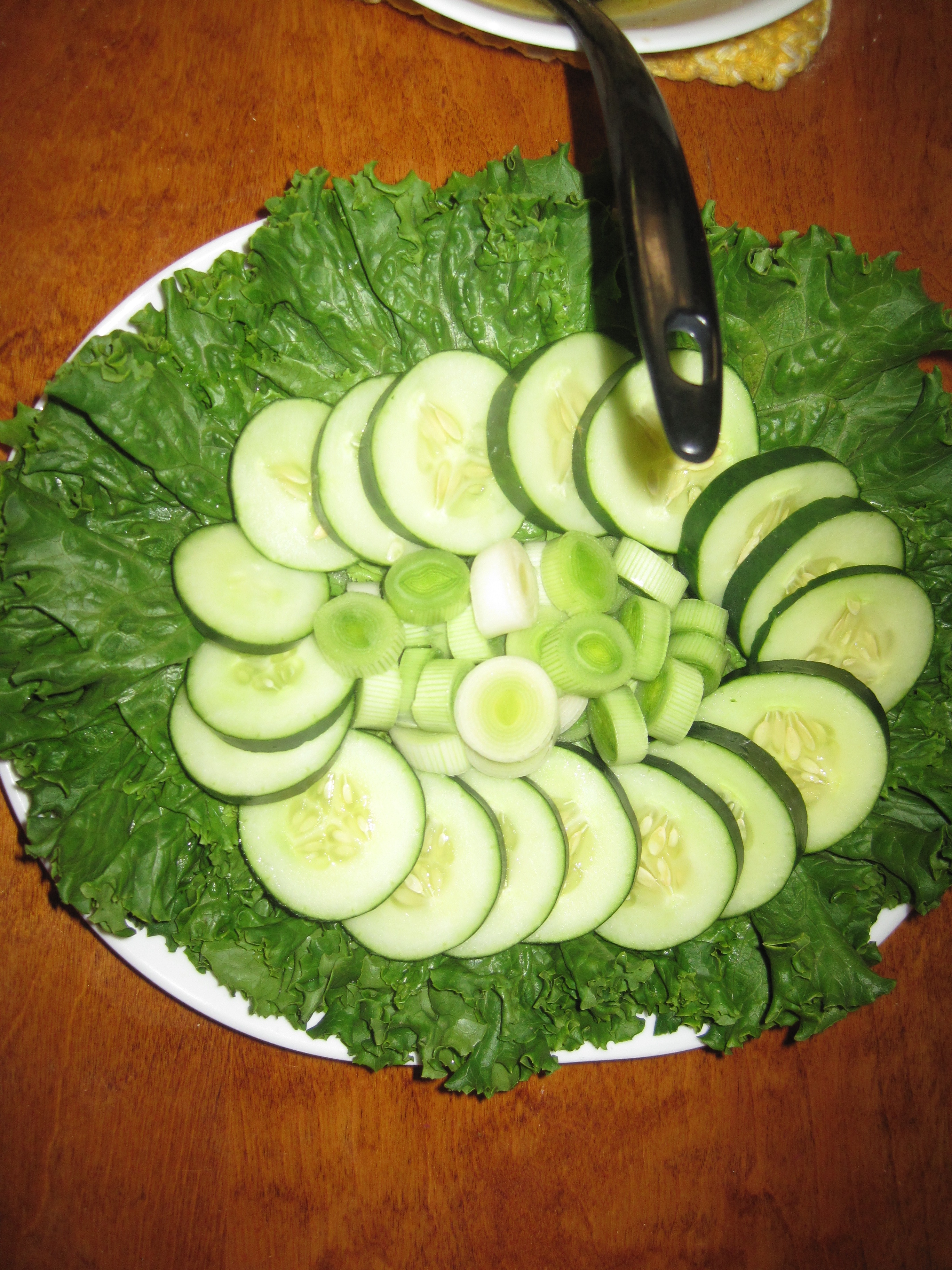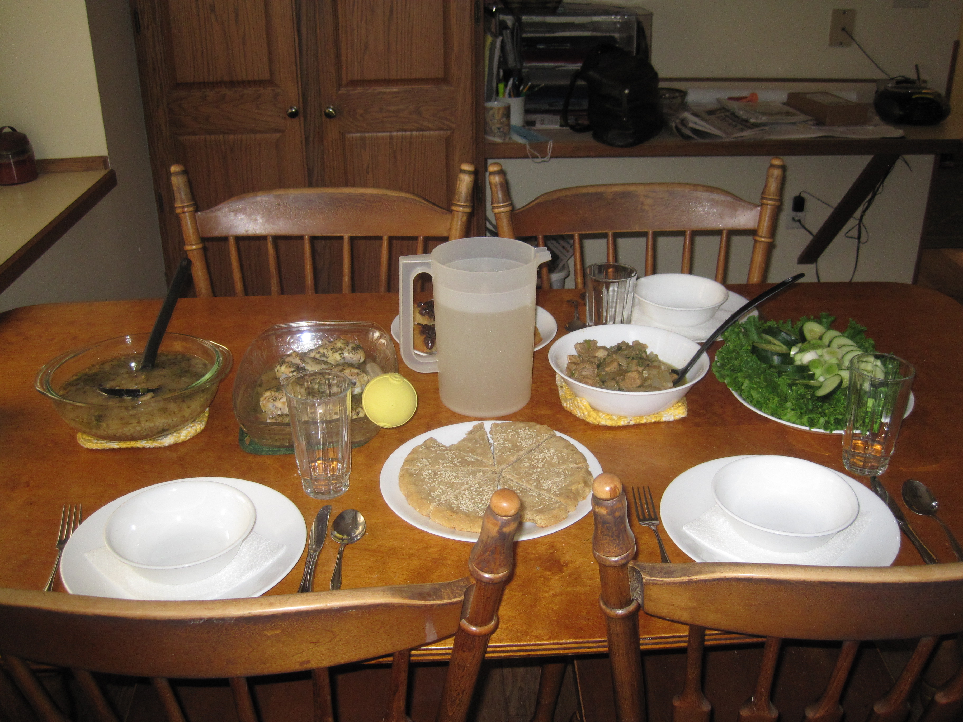 With the history in mind, I set out planning a menu. Since the Egyptians served lots of bread and either beer or wine for all meals, I began by baking a plain white pizza crust (for almost as long as there has been bread, the elites have had access to leavened white bread) with an egg wash and sesame seeds and pouring a pitcher of grape juice (my wine substitute). I then moved on to protein and vegetables. The Egyptians are recorded to have made a fair amount of stews, perhaps since they can be kept warm easily and since stewing would probably help tenderize the tough oxen that were generally only slaughtered once their productivity began to decline. Thus, I made a beef stew with a bit of vegetable oil to sauté the onions, garlic, leeks, and beef with the cumin, and salt, water to simmer it, and celery and parsley added near the end for more flavor. I also made a lentil stew with lentils, onion, garlic, leeks, cumin, coriander, and salt, which cooked as the beef stew cooked. When that was nearly done I put some salmon in the oven, basted with butter and seasoned with salt, dill, and parsley. While the Egyptians did not eat a huge amount of dairy products, there was certainly butter and cheese available. While that cooked I arranged a vegetable platter for the side and a fruit platter for dessert. The vegetables included lettuce, cucumbers, parsley, and roasted garlic. Although ancient societies would often eat raw onions and leeks, the last feast proved that to be a bit much for me. For dessert, I prepared the most common ancient dessert by far: a fruit platter. With summer in full swing, I was able to create a striking platter of red, green, and black grapes with watermelon cubes. By then, everything was ready, and the moment of truth had arrived.