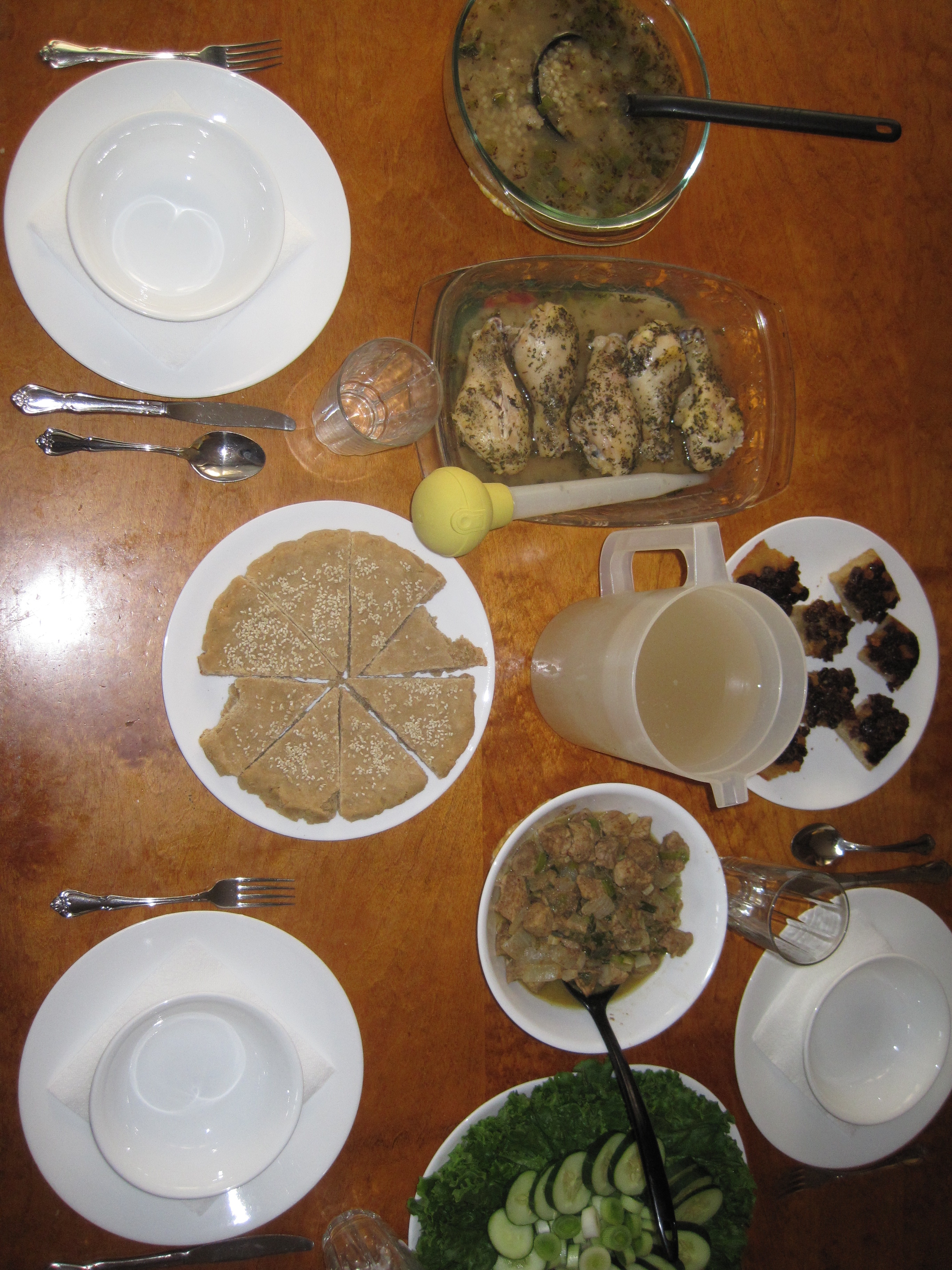 Upon consideration, I can say with certainty that the feast was a success. The beef and lentil stews were flavorful and the beef was very tender, the fish with butter and herbs was wonderful, and the roasted garlic was fantastic on the bread. Meanwhile, the grape juice, vegetables, and fruit provided a pleasant fresh contrast. Overall, the feast was quite enjoyable. I seem to be getting the hang of this. Although the next feast will not be until October since I am back at school and will not be home until then, I will post something when I have decided for sure on a theme. Most likely, it will be Indus Valley, but only time will tell.