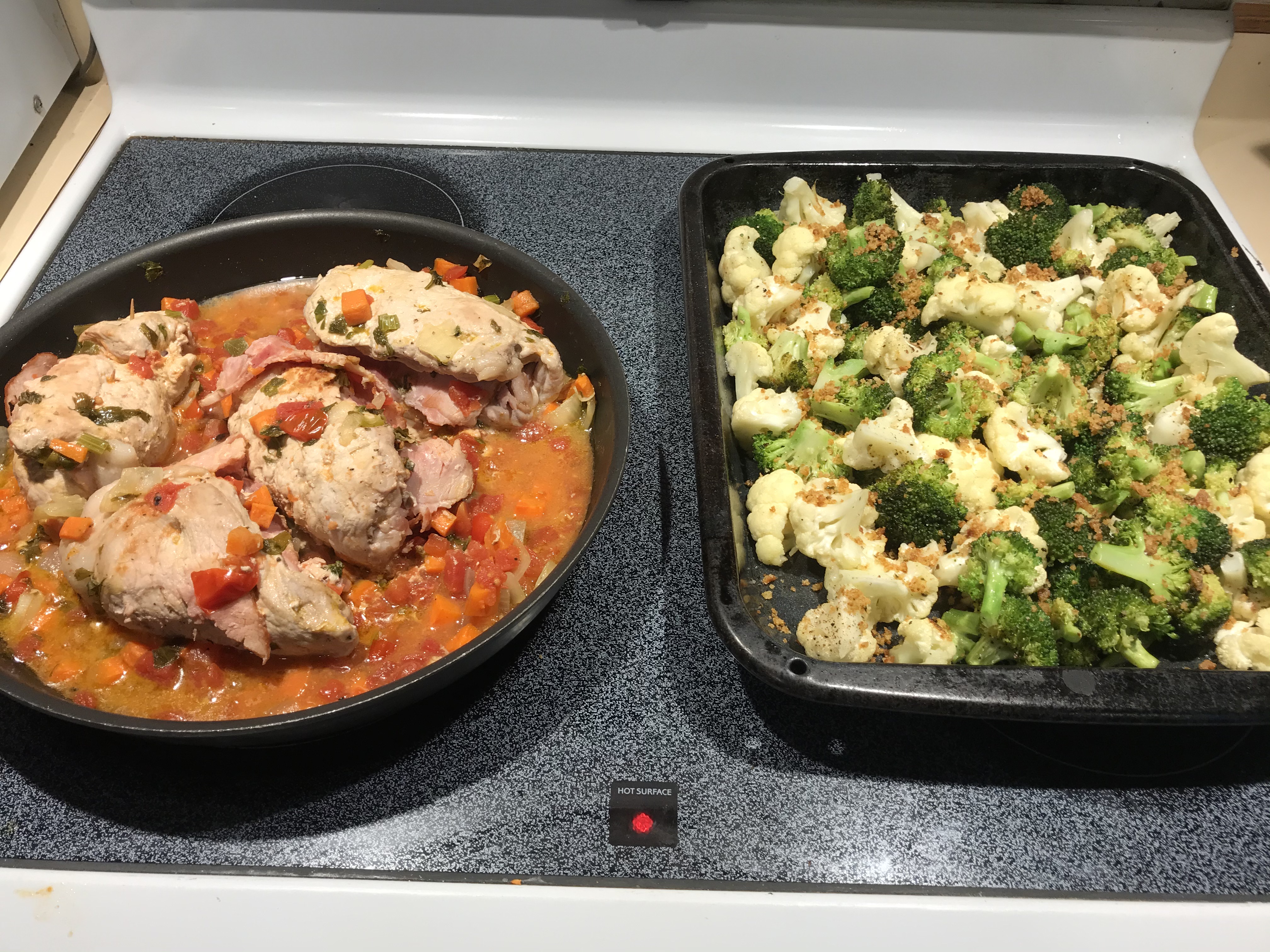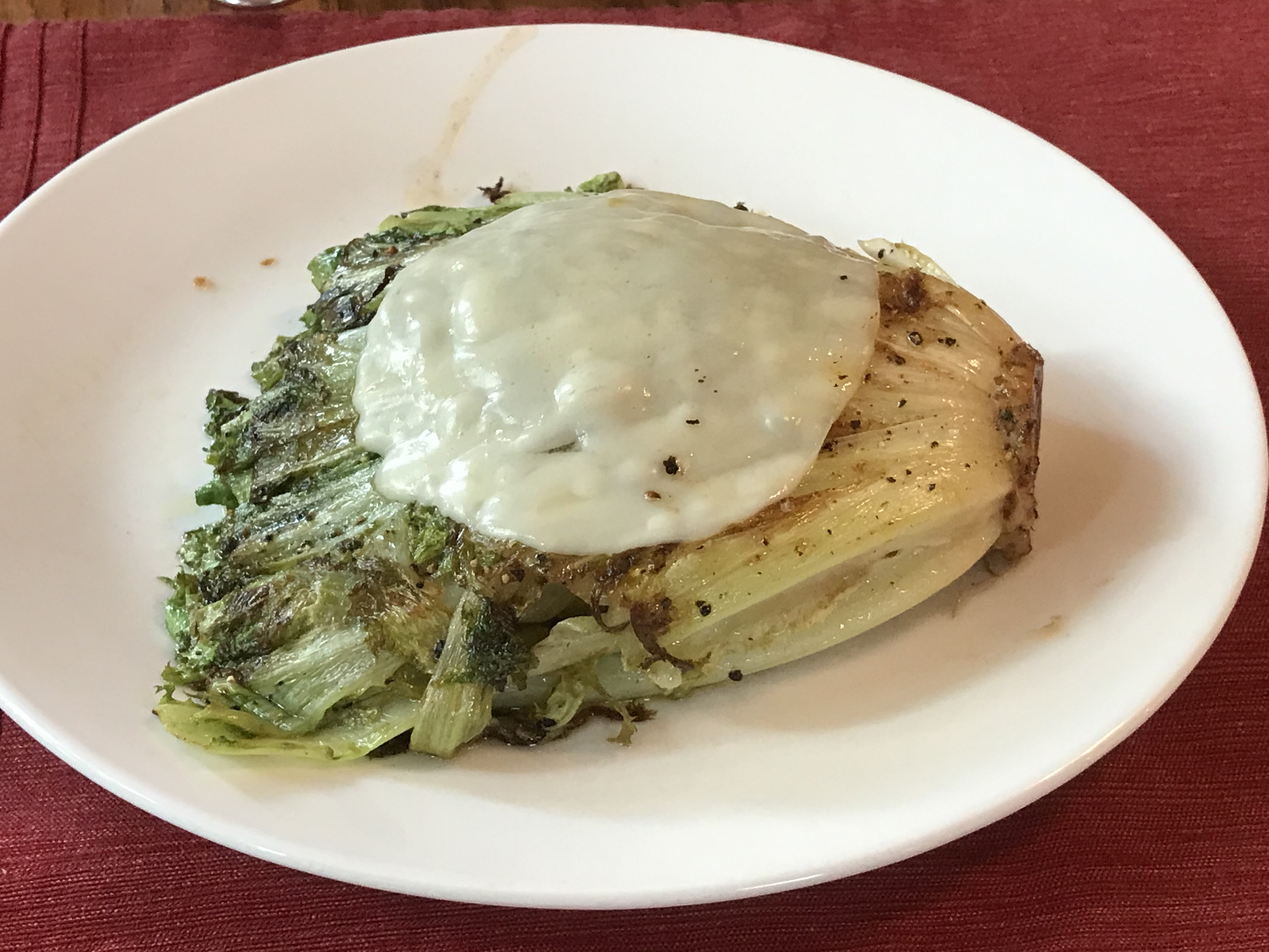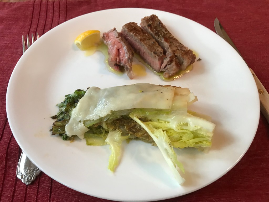 Since the steak needed time to rest before slicing, I used the already-hot skillet to cook the chicory. Also called curly endive, it is a slightly bitter green. The darker, more bitter outer leaves are removed and either reserved for another use or discarded, while the lighter yellow and white hearts are seared briefly over very high heat with olive oil, salt, and pepper. Once removed from the heat source, a thin slice of smoked mozzarella is added on top to melt. The store didn’t have smoked mozzarella, so I got a deli pack of lightly smoked provolone. I only needed one slice, but provolone makes really good grilled cheese, the perfect accompaniment to leftover soup or a salad of the leftover chicory leaves.