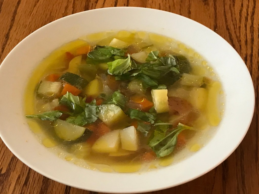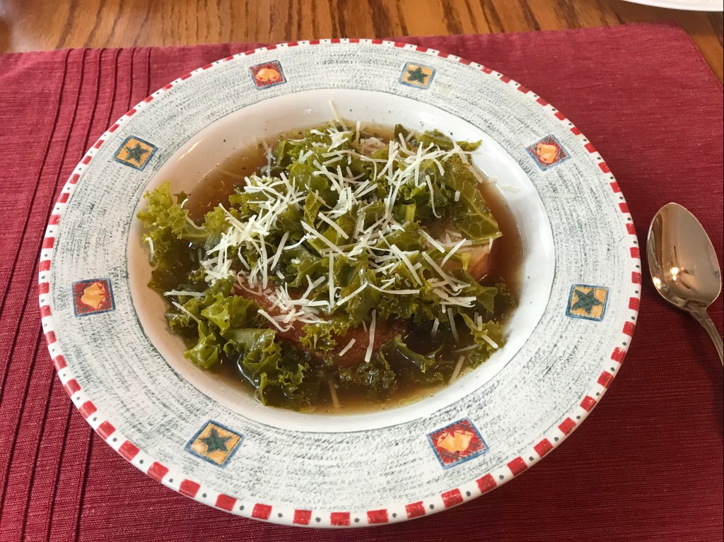 The soup is a fine example of the rustic simplicity of many Tuscan dishes. The kale, in this case harvested a few hours before from a pot on the deck, is cooked in a mixture of chicken and beef broth. Meanwhile, slices of Italian bread are toasted under the broiler and rubbed with garlic. Pieces of toast are then placed in the soup bowls, given a sprinkling of salt, pepper, and olive oil, topped with the cooked kale, and given a bit more salt, pepper and oil before being finished with the broth and a sprinkle of parmesan cheese. The layered effect this gave the soup was both interesting and pretty, and it tasted as good as it looked.