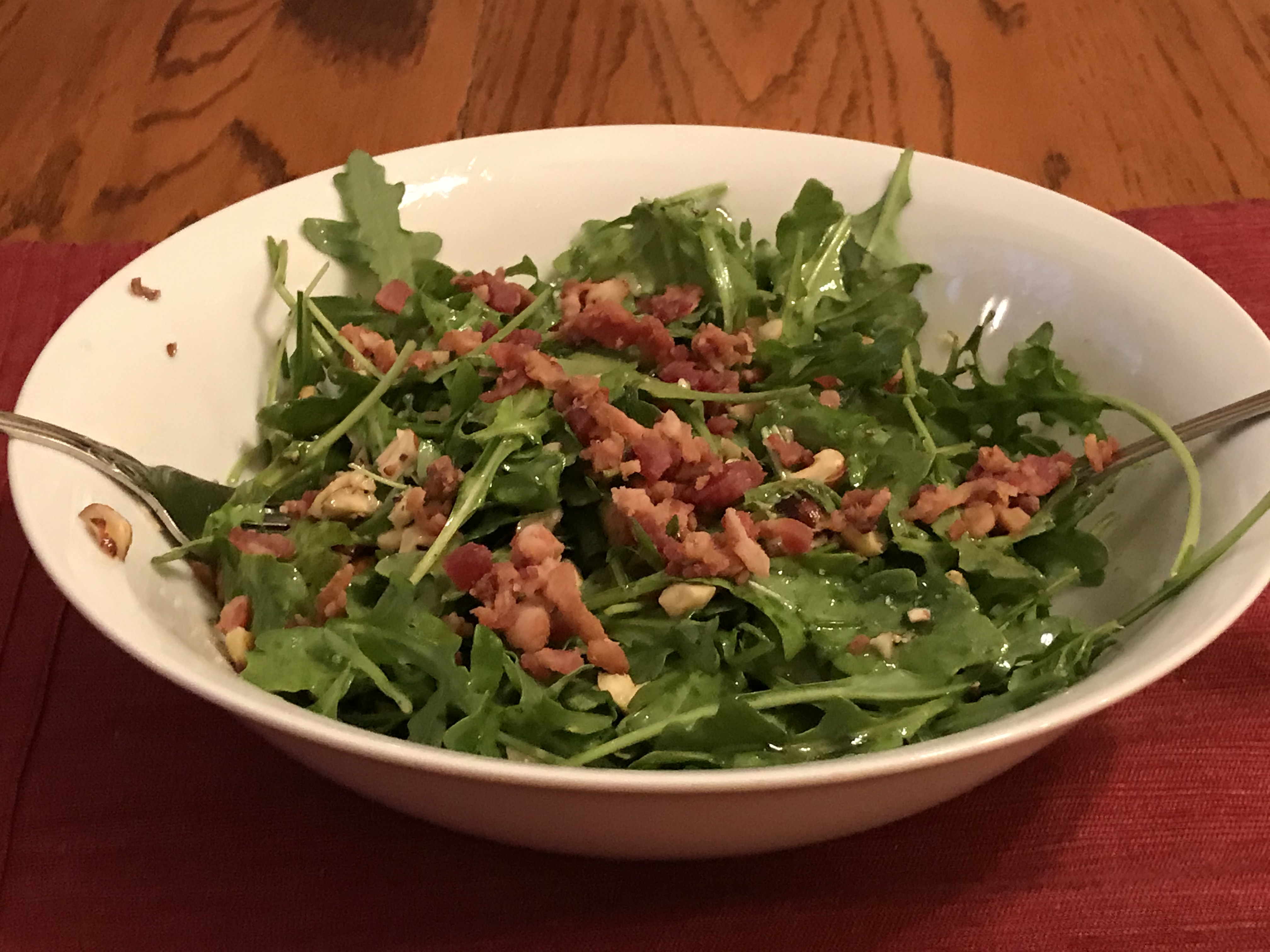 My first thought was to use chicken livers. Many large supermarkets have them, they aren’t expensive, and while not the same as fat-engorged duck or goose liver, they are still livers and still from poultry. If I could get over my squeamishness about eating liver, I could sauté them with extra butter to bring the fat level closer to that of actual foie gras. As it turns out, I’m not quite ready to go that far. As detailed in the previous post, I’ve eaten oxtail and loved it. I don’t think beef tongue would be an issue (it’s just another muscle). I’d even be willing to try pigs’ feet if they were cooked in a way to get the skin nice and crispy. Liver is still another story, though, especially knowing what the liver does. Besides, chicken livers look really unappetizing. In the end, I settled on bacon pieces. While not remotely the same thing as foie gras, it’s a good choice on almost any salad. All of the other salad ingredients were unchanged. Unsurprisingly, the blend of peppery arugula, salty bacon, and crunchy, toasty hazelnuts, accented with a vinaigrette, was delicious.