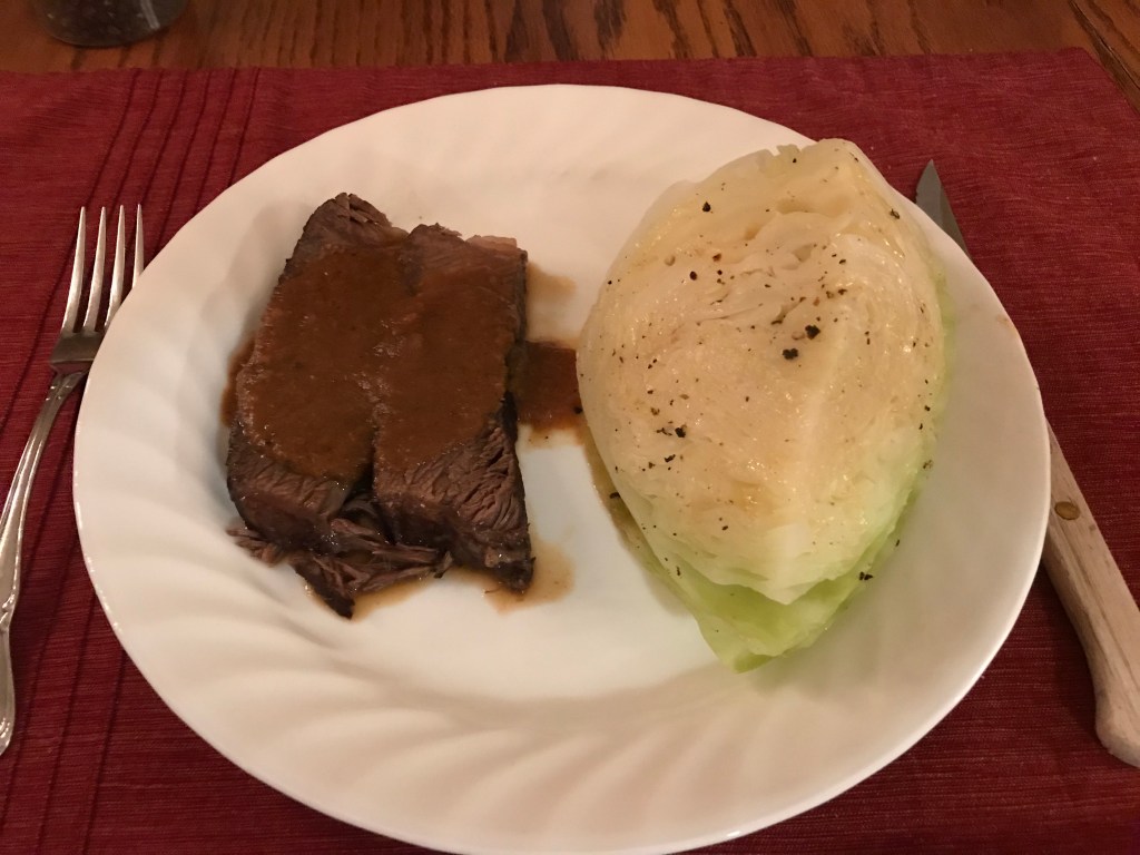 After the cutting board mishap, the beef was also delicious. The low, slow cooking had made it extremely tender, and there was enough leftover sauce to use with a pork tenderloin a few days later, once all the beef had been eaten. The cabbage, I must admit, was not my favorite. It was sauced with a mix of butter, fresh lemon juice, salt, pepper, and nutmeg, but the proportions were not to my taste. Though freshly squeezed lemon juice has many good uses (like lemonade, salad dressing, on seafood, etc.), it needs to be tempered with something to shine. Here there was not enough butter to do so. But again, that is a matter of personal taste.