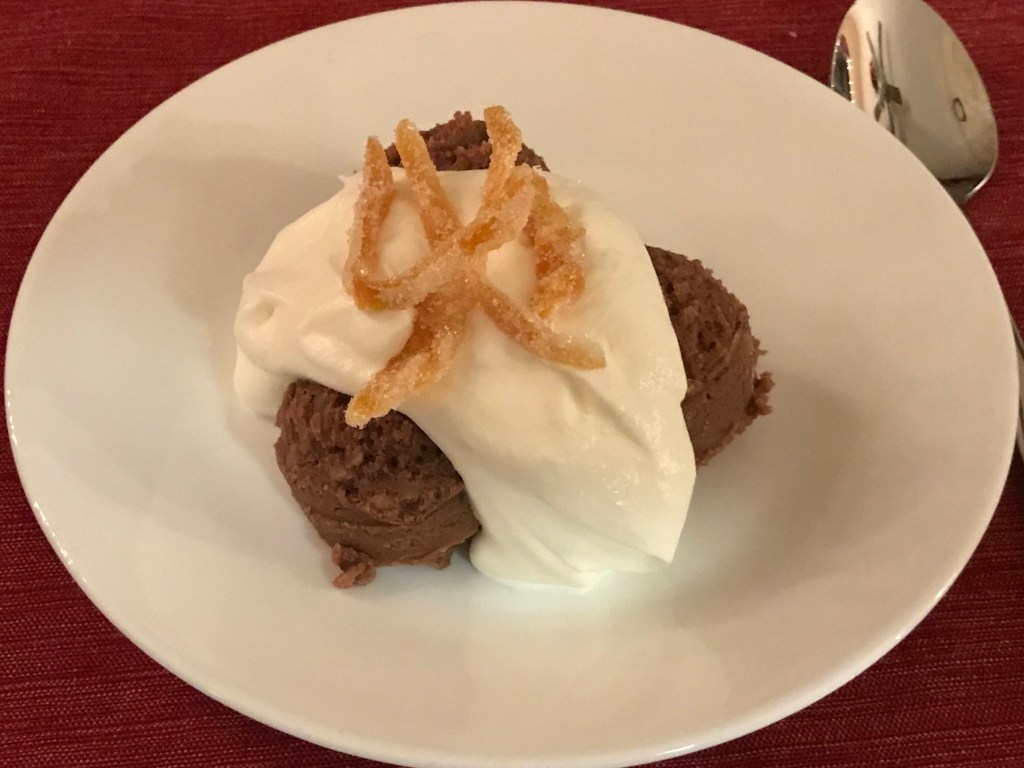 Cabbage and chestnuts are favorites in Piedmontese cuisine. The cabbage is served with a straightforward lemon butter sauce. Dessert, however, is quite unusual. Cooked chestnuts are warmed in a mix of milk, sugar, and cocoa, then mashed and put through a food mill onto the plates. I don’t happen to have a food mill, so I used a small ice cream scoop to put scoops of puree on the plates. These could then be topped with whipped cream and candied orange peel as directed.