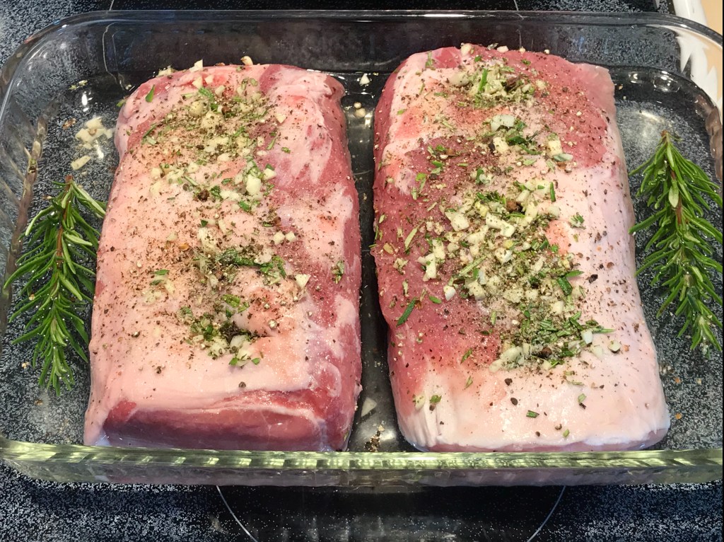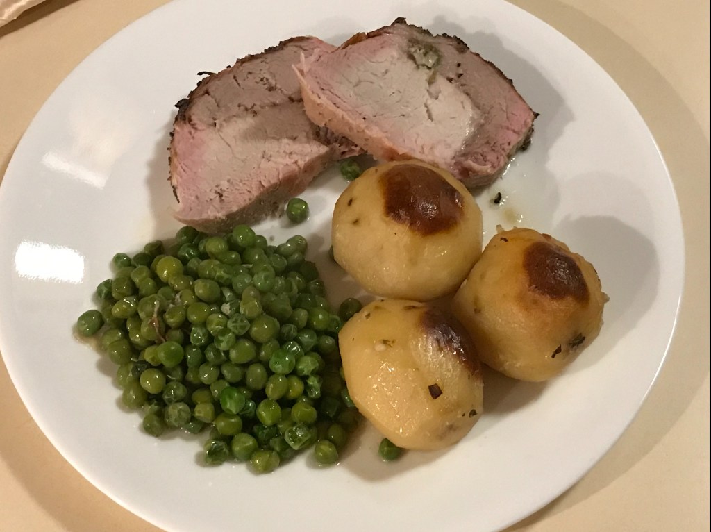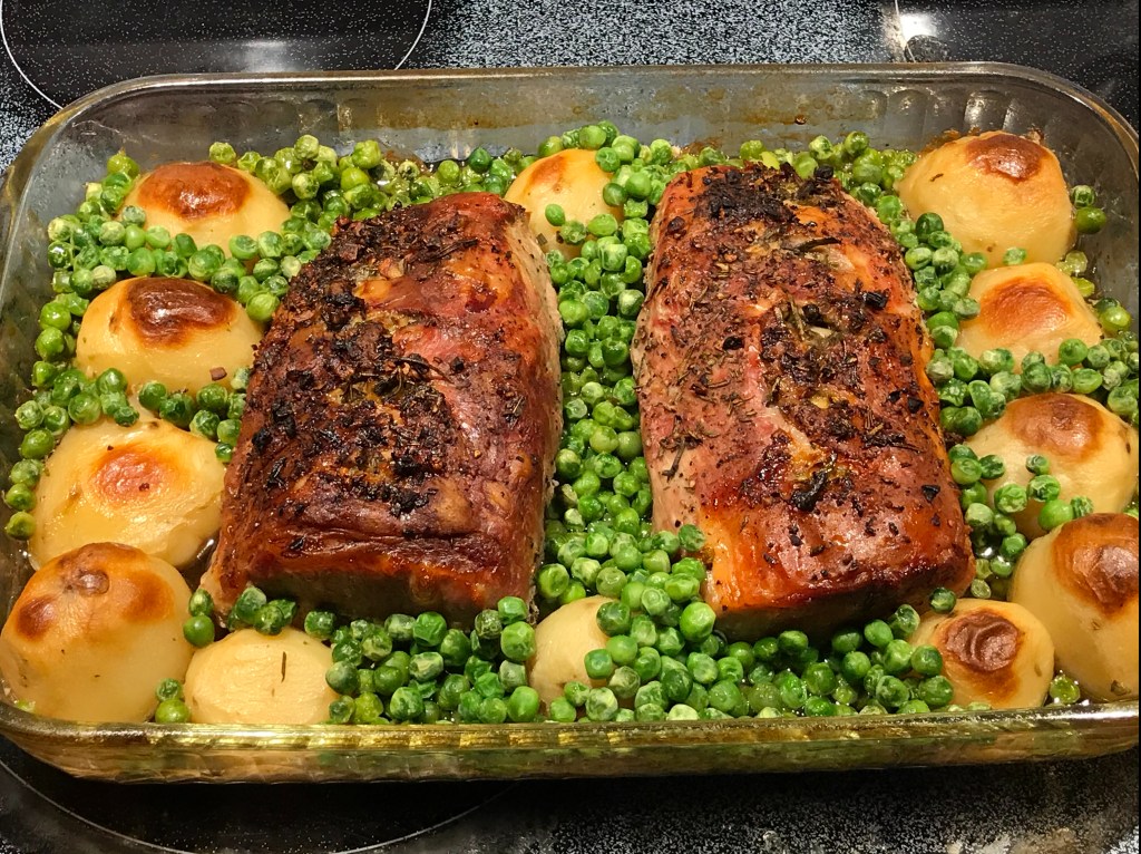 Here is a Tuscan recipe that highlights the diversity of Italian cuisine. Featuring pork, potatoes, and peas, roasted and basted in a water bath, it wouldn’t look out of place at a US Midwestern supper club. Cuts are made in the pork, which are then stuffed with a mix of chopped garlic and herbs and stuck with cloves. Water is added to the pan, not enough to cover, but enough to keep the meat from drying out during a long cooking in a hot oven. Since the water will never get hotter than 212 degrees Fahrenheit and absorbs a lot of heat, the pork cooks slowly and stays wonderfully tender while the exposed top exterior crisps up. Just make sure to put whatever side of the meat has more fat on top. Not only will the melting fat keep the meat from drying out, it forms a delightfully crispy, crackly layer.