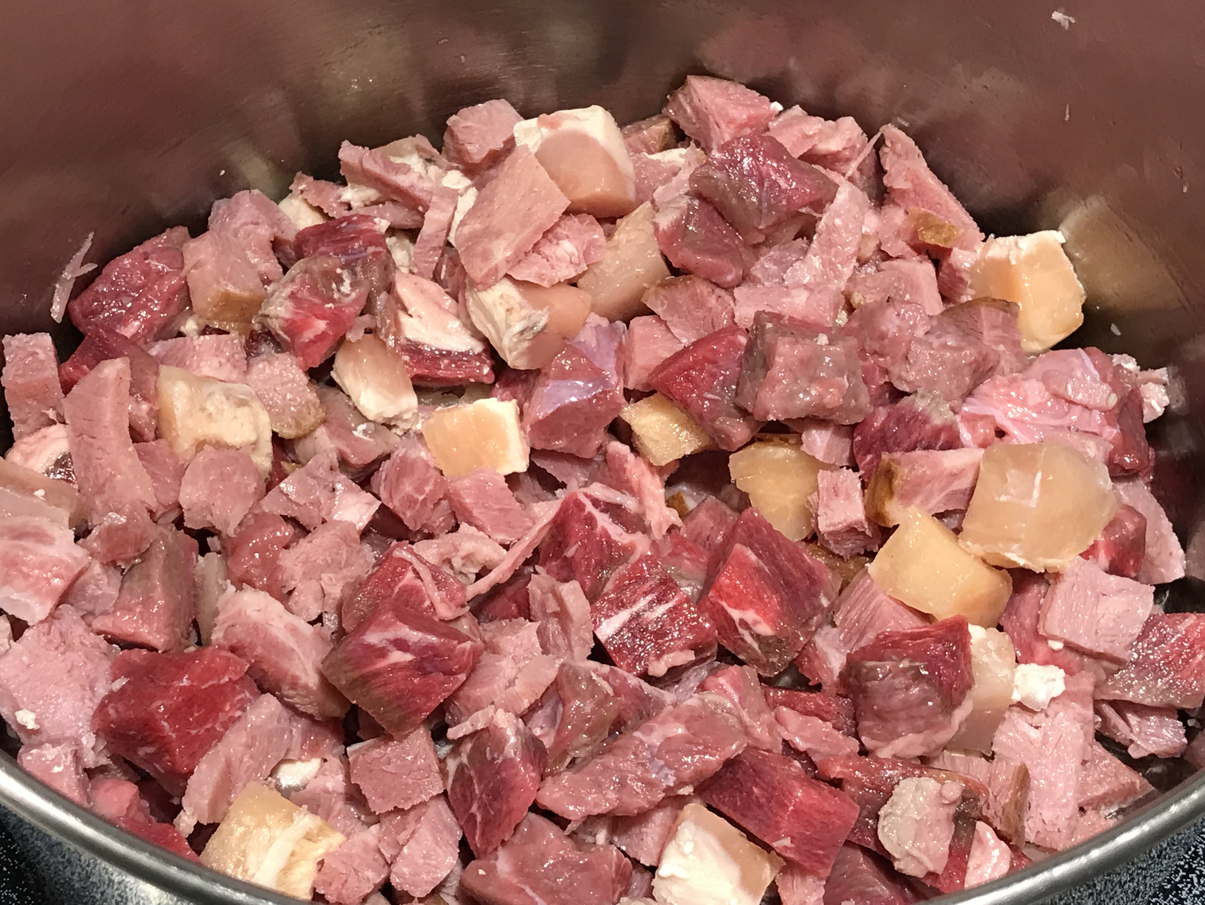 1. Put the beef, chicken, and ham into a large pot and turn on the burner to medium, stirring frequently. When it starts to brown, add 1 cup of water and scrape any browned bits off the bottom of the pot.