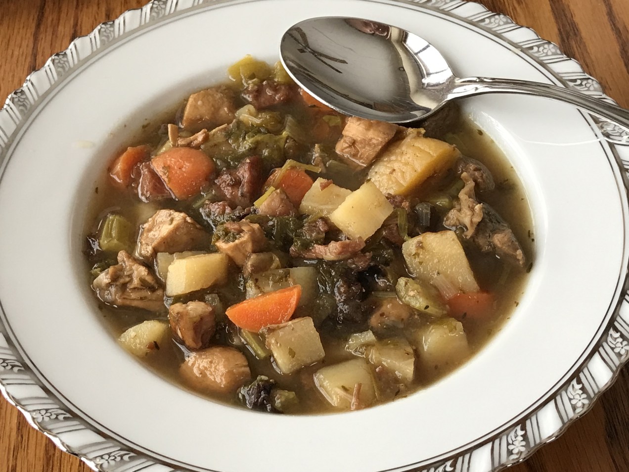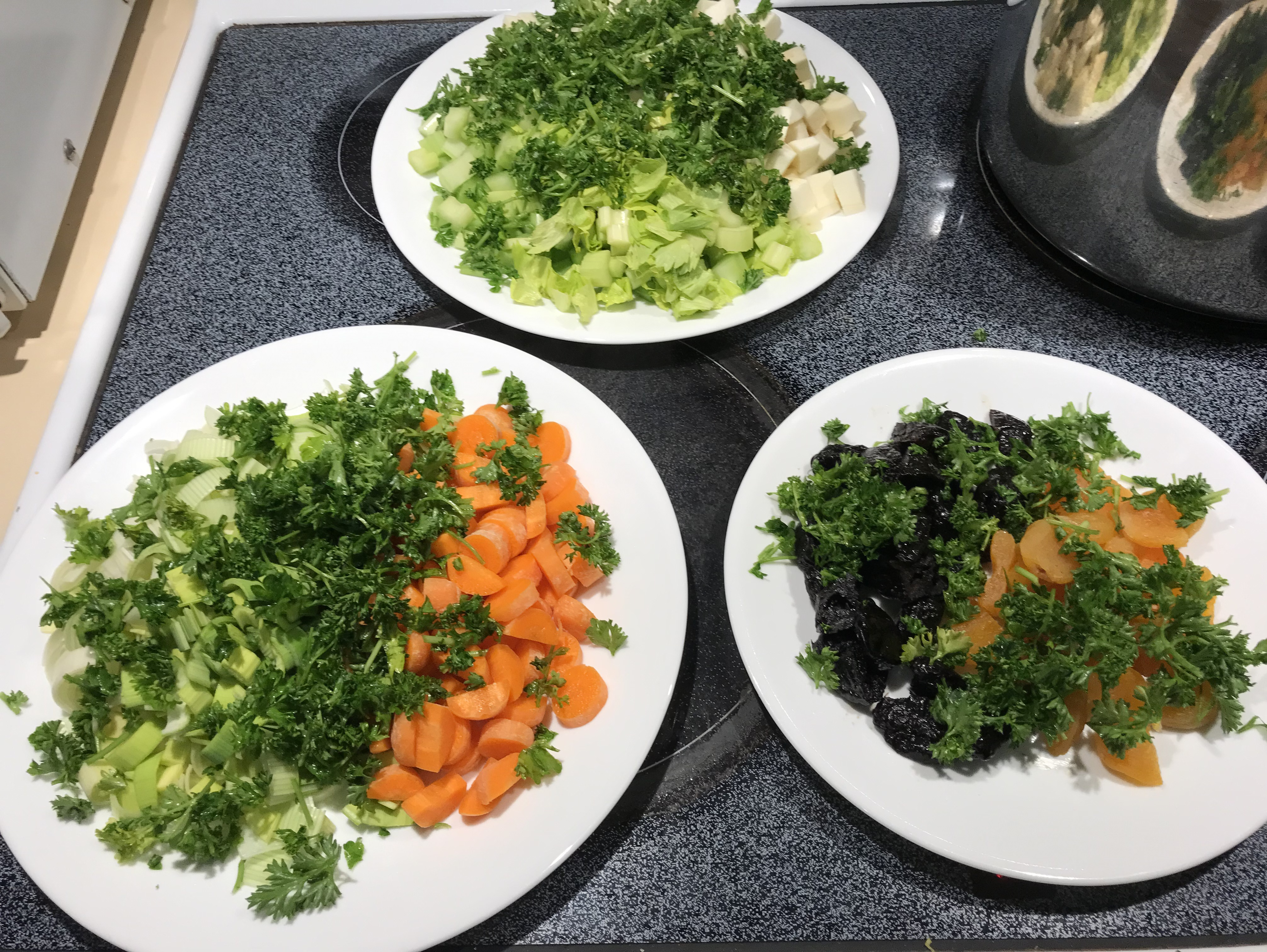 3. Add the carrots, celery, parsnips, leek, prunes, apricots, and parsley. Stir and add more water to cover. Simmer for another 45 minutes.
