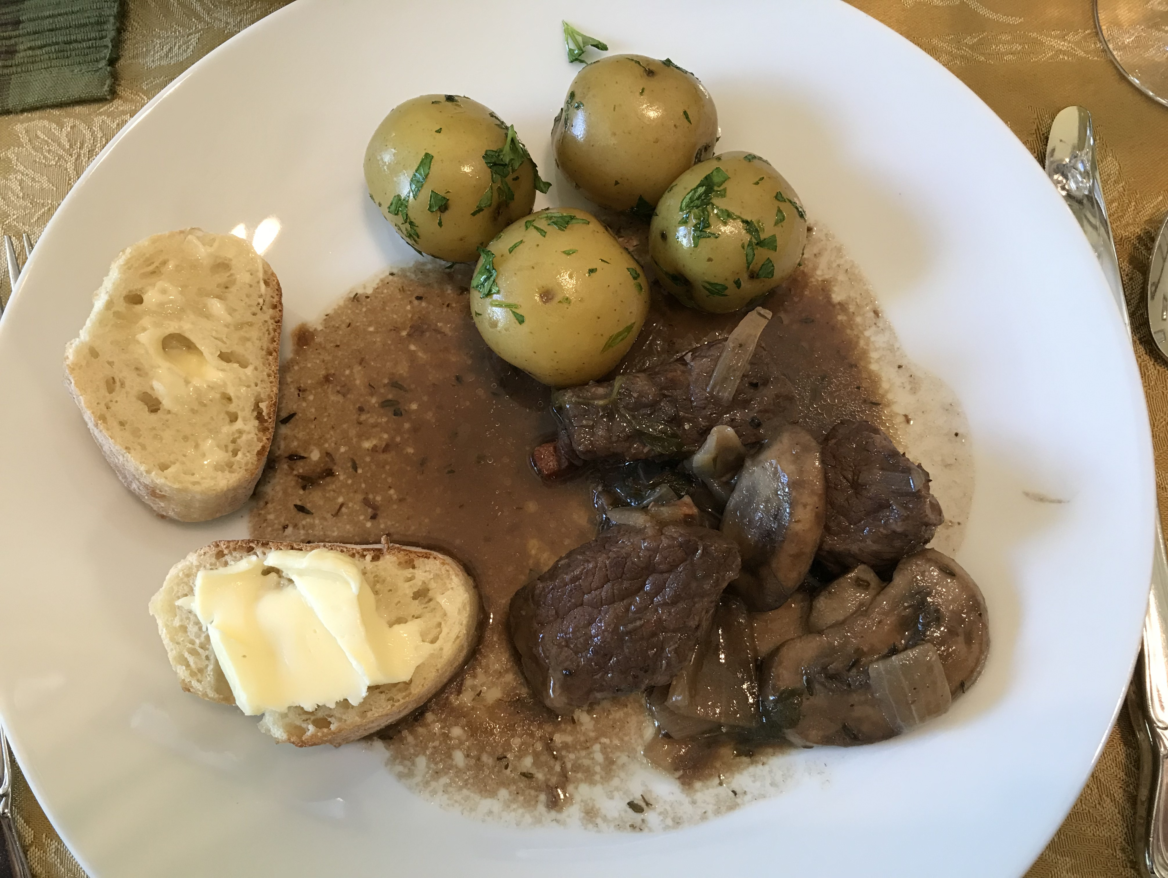 Along with Bordeaux in the southwest, the area of Burgundy in the east has been one of France’s most prestigious wine regions since the Middle Ages. Vineyards there produce some of the most expensive pinot noir in the world, along with more affordable wine. The recipe calls for a good but not extravagant red burgundy. Since the local grocery store didn’t have French burgundy, I got a bottle of California pinot noir. Supposedly the vines were started with cuttings from Burgundy, and it was under $20 but not the absolute cheapest option. In other words, mid-priced by flyover country standards, and there was some leftover to serve with the stew.