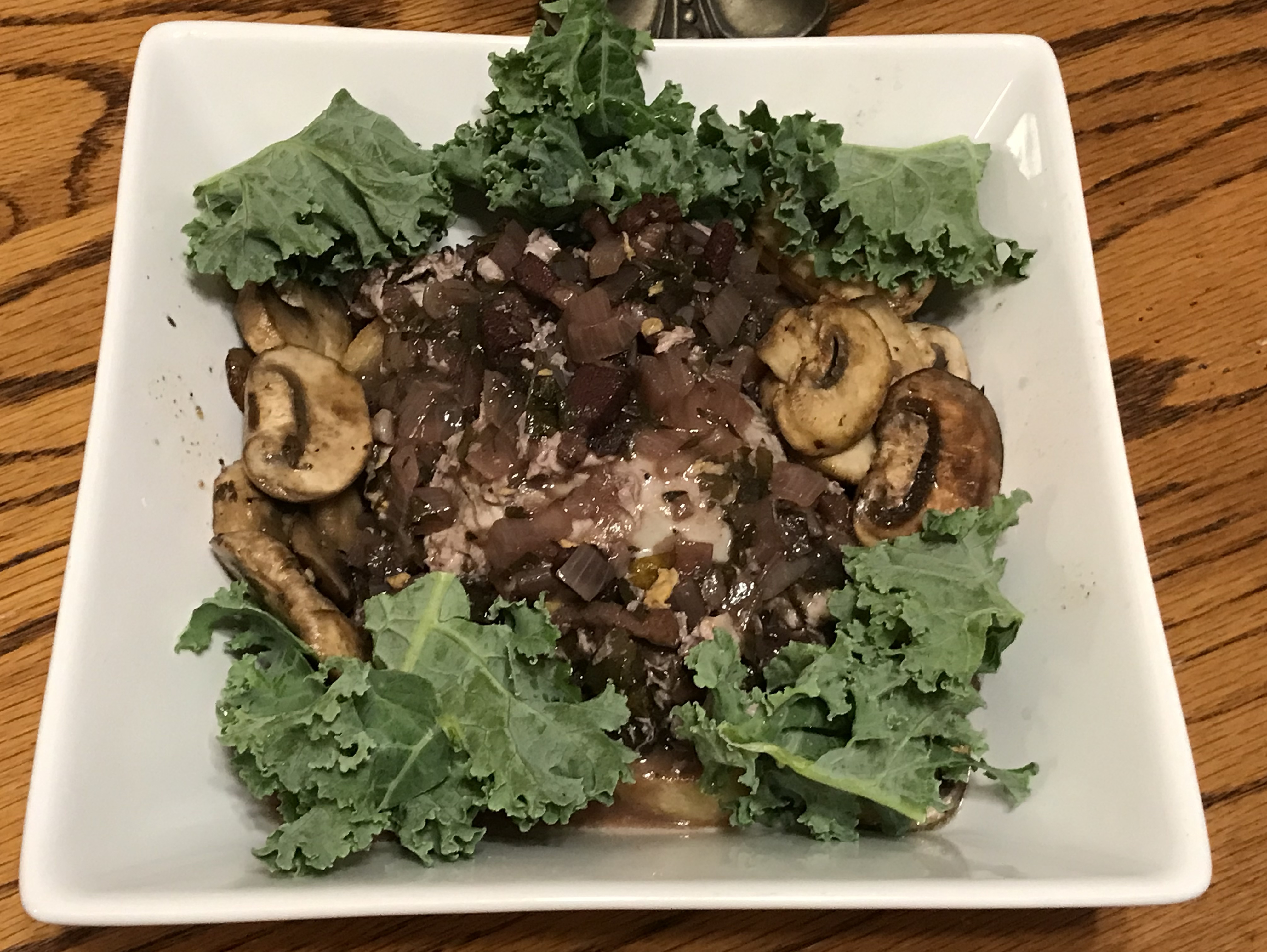 Even though I don’t usually like poached eggs, this was really good. The egg yolks blended into the sauce once the eggs were cut, making their runniness less apparent. All the butter, to toast the bread, sauté the mushrooms, and make roux to thicken the sauce probably helped too. The leftover sauce was even better with scrambled eggs. As an extra garnish, I added some kale, which holds up next to the hot ingredients much better than lettuce.