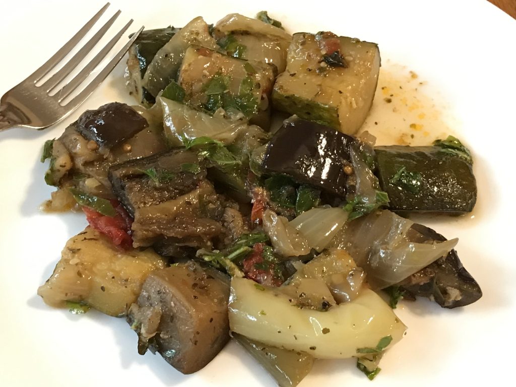 1. Combine the eggplant, zucchini, bell pepper, onion, tomatoes, garlic, olive oil, and minced parsley stems in a large pot with 2 tablespoons water.