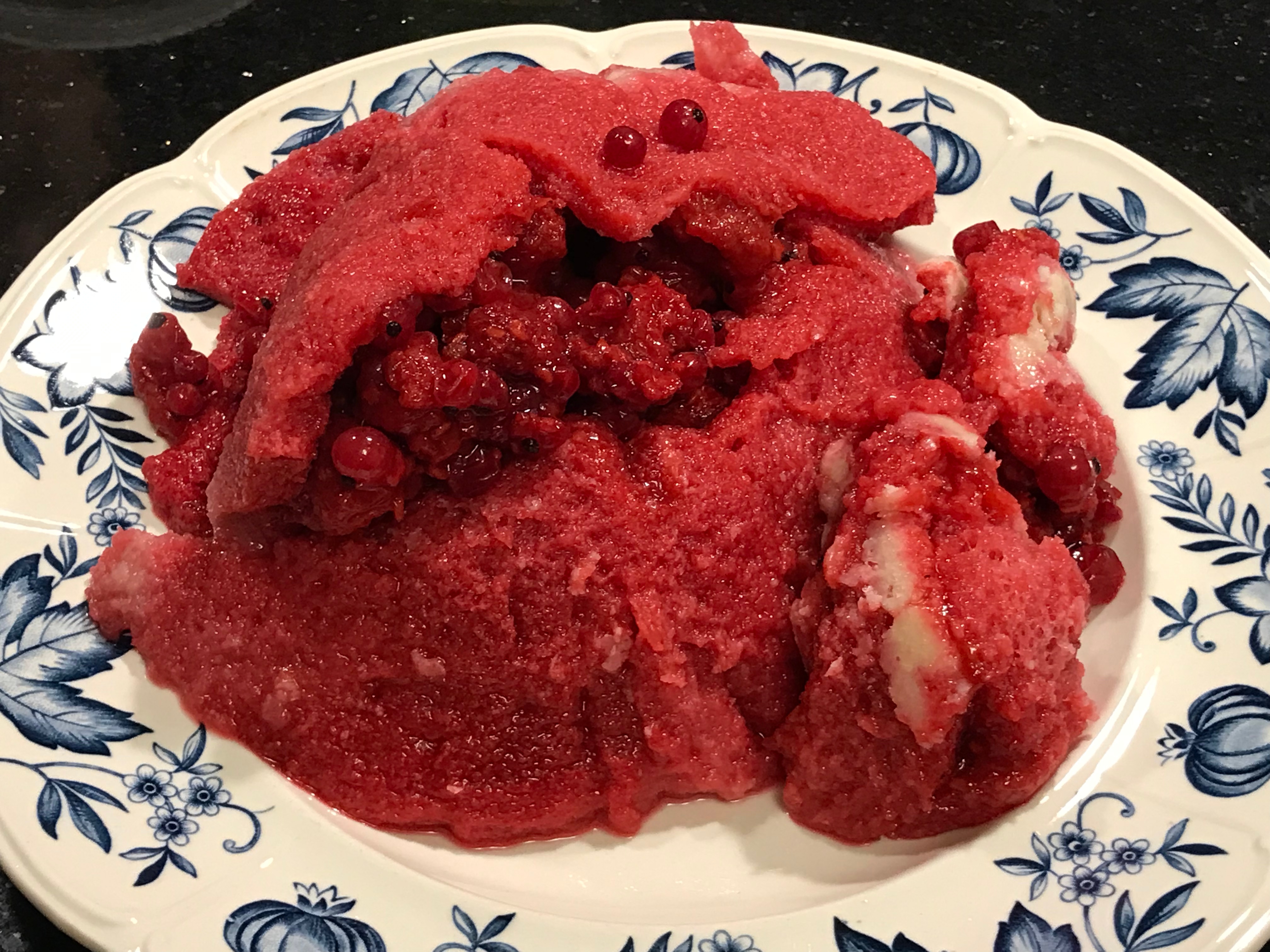 This turned out to be unnecessary. Odd as it sounded, the bread worked perfectly. Due to its gluten structure, it soaked up the juices like a sponge and held together even when fully saturated. Cake would typically fall apart in a similar situation. Beyond that, the bread balanced out the tart currants and raspberries very well. It was indeed soggy, but in a good way.