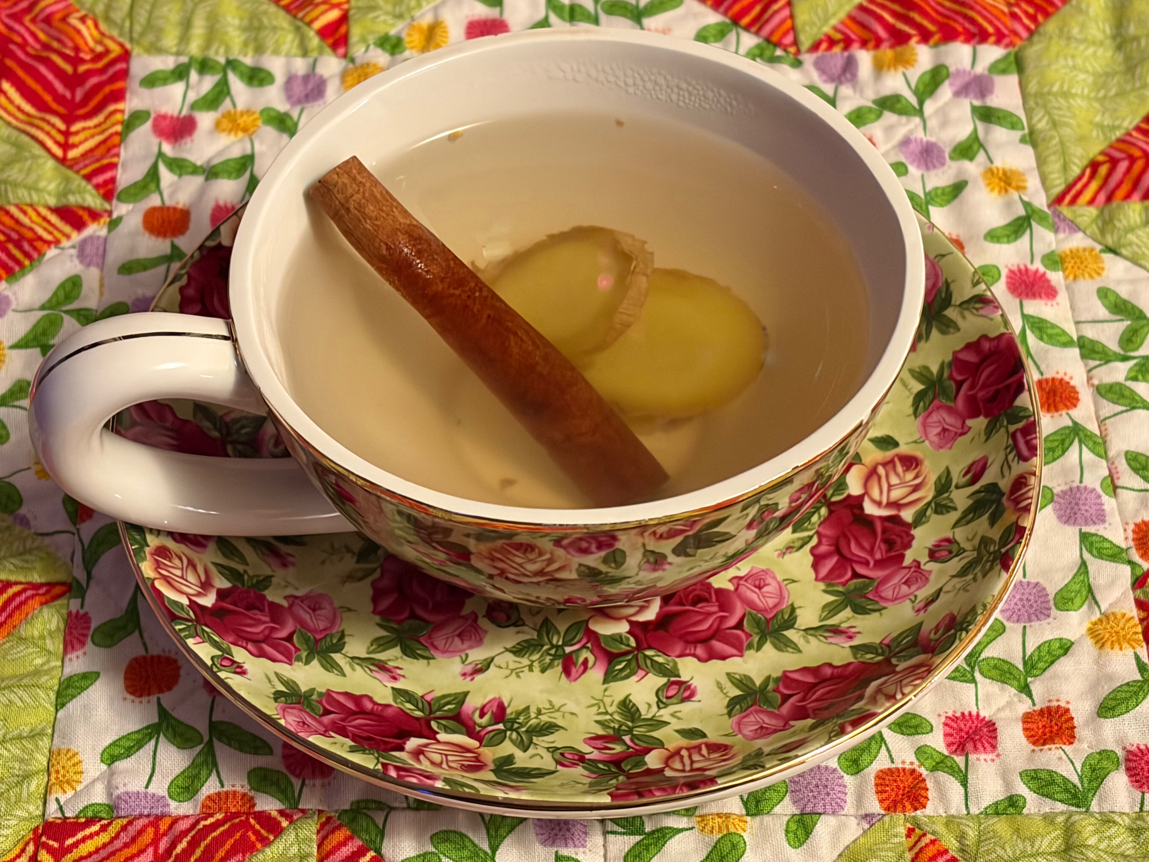 All you need is a few slices of fresh ginger and about a teaspoon of honey per cup. Add boiling water, stir with a cinnamon stick, and leave it in.  The normal cassia cinnamon sticks found at the grocery store are good – there’s no need to hunt down the softer, more expensive “Ceylon cinnamon.” The subtler Ceylon cinnamon would be completely overwhelmed by the ginger. Once the tea is cool enough to drink, the flavors will be fully infused. Just give it another stir before enjoying. The ginger slices and cinnamon stick can be reused for a second cup of tea. The flavor won’t be as strong, but it is still distinctive and tasty.