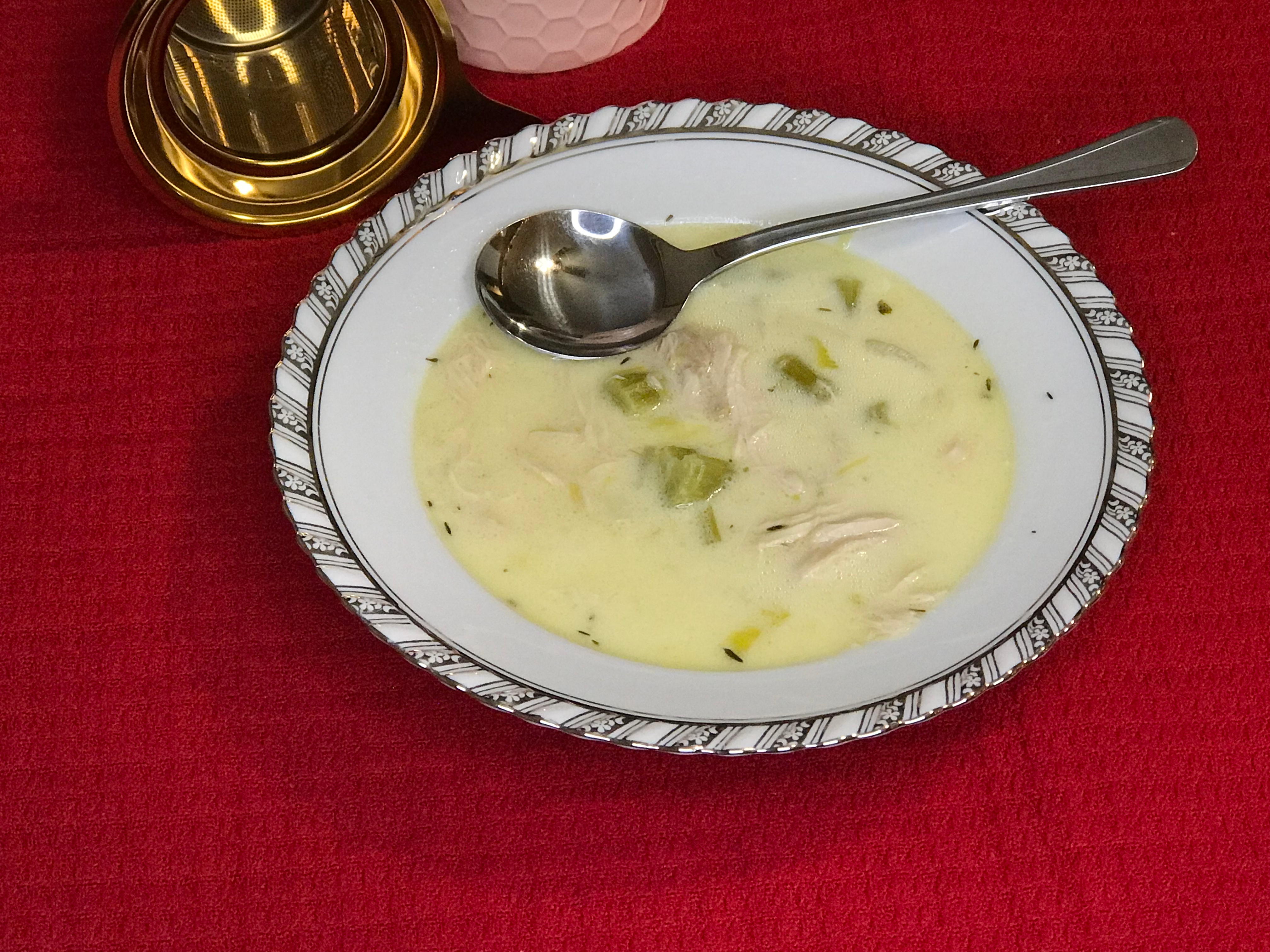 Evidence of prosperity can be seen the soup recipe, which uses chicken, eggs, cream, and vegetables that are not ultimately eaten. Since using vegetables to flavor the stock but then discarding them offends my sensibilities, I ended up returning them to the pot after removing the chicken skin and bones and straining the broth. The celery and leeks were a little overcooked, but still added some nice extra texture to the soup.