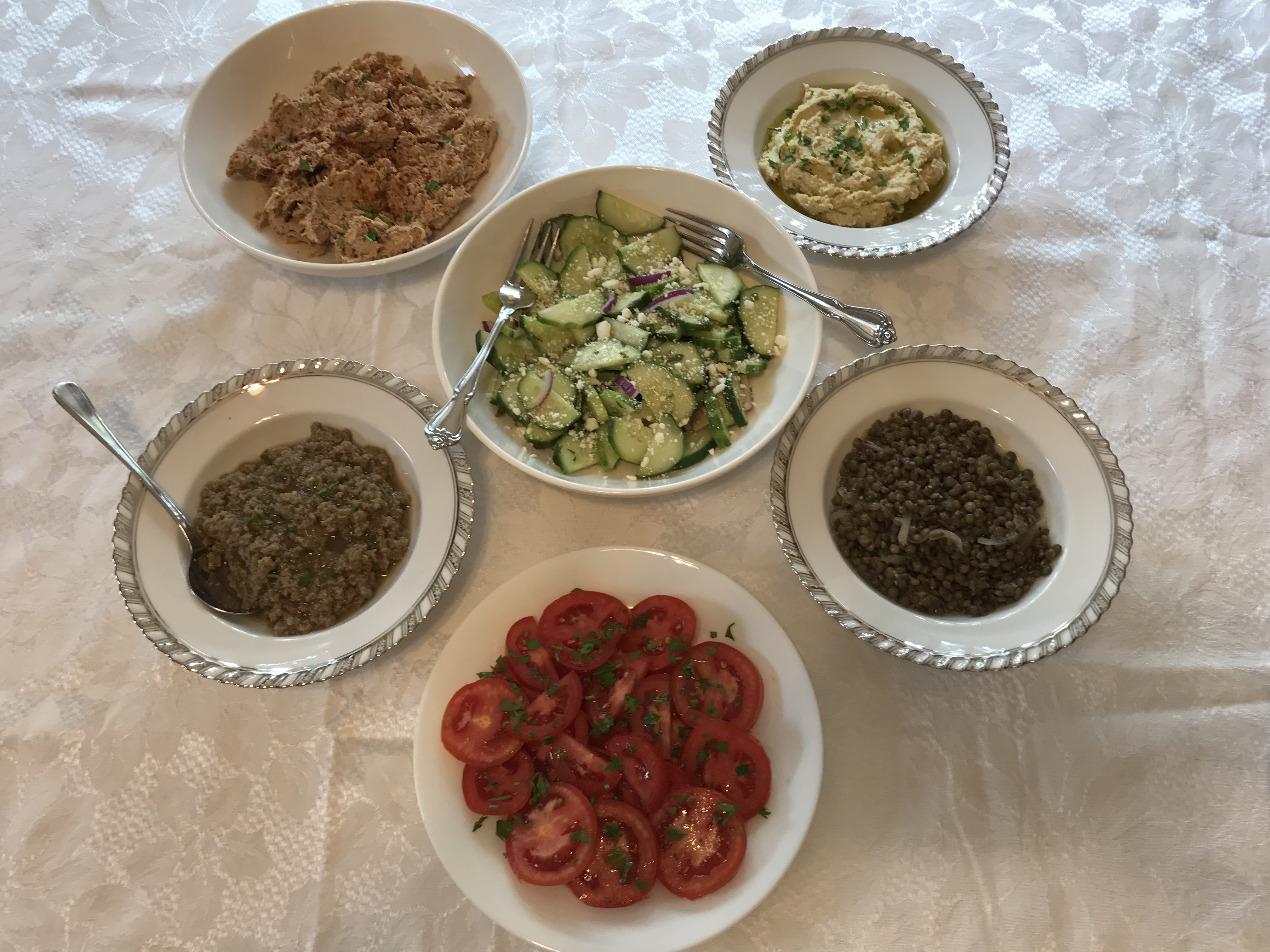 Menu: Hummus, Tahini Dip, Tomato Salad, Cucumber Salad, French-Style Lentil Salad, Turkish-Style Chicken with Walnut Sauce (last two recipes in subsequent posts)