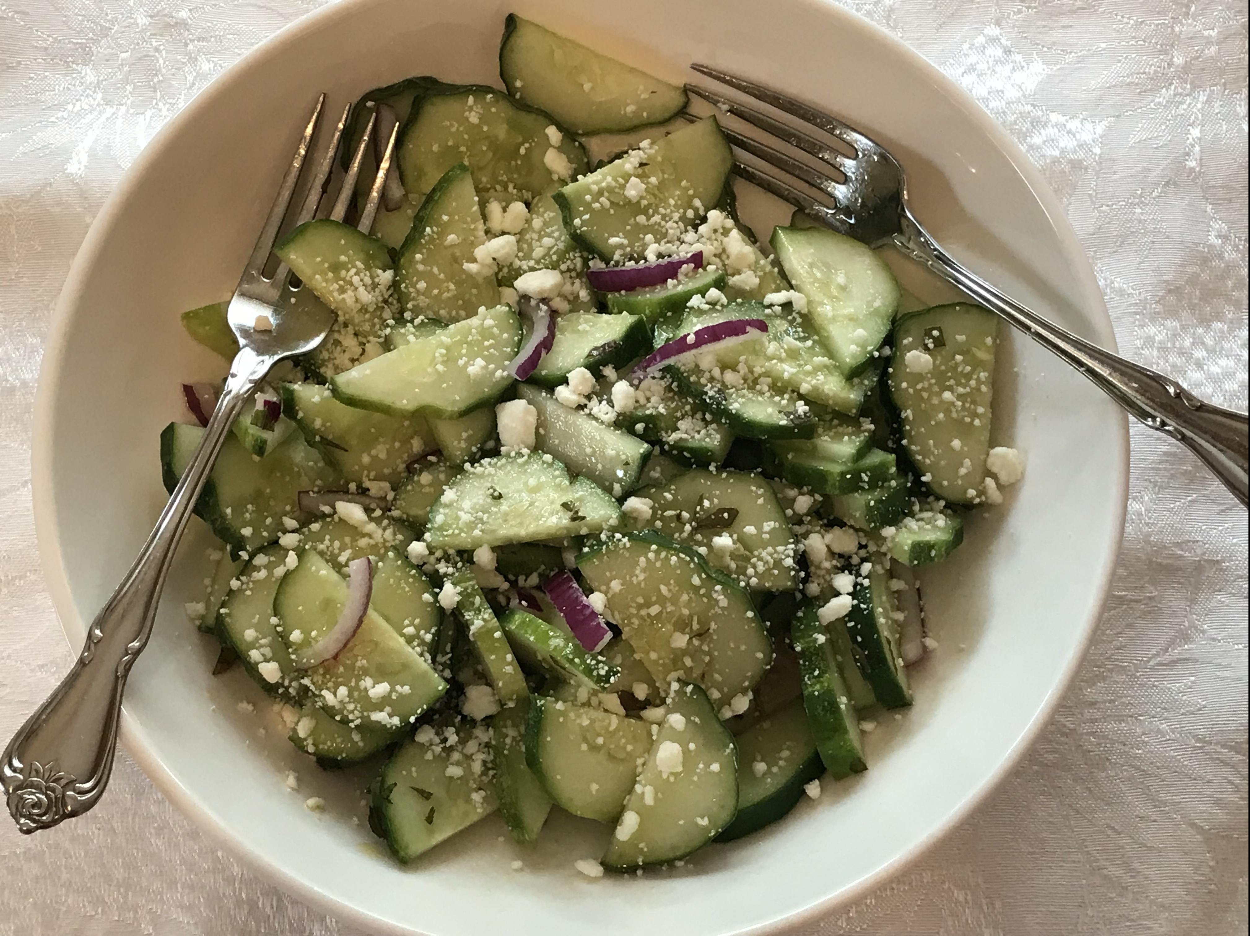 For a better-tasting salad, use 2 large or 4 small cucumbers. Peel them if desired, and slice thinly. Toss with ¼ red onion, also thinly sliced, 2 tbsp olive oil, 1 tbsp red or white wine vinegar, and a few finely chopped mint leaves. If desired, add a few crumbles of feta cheese.