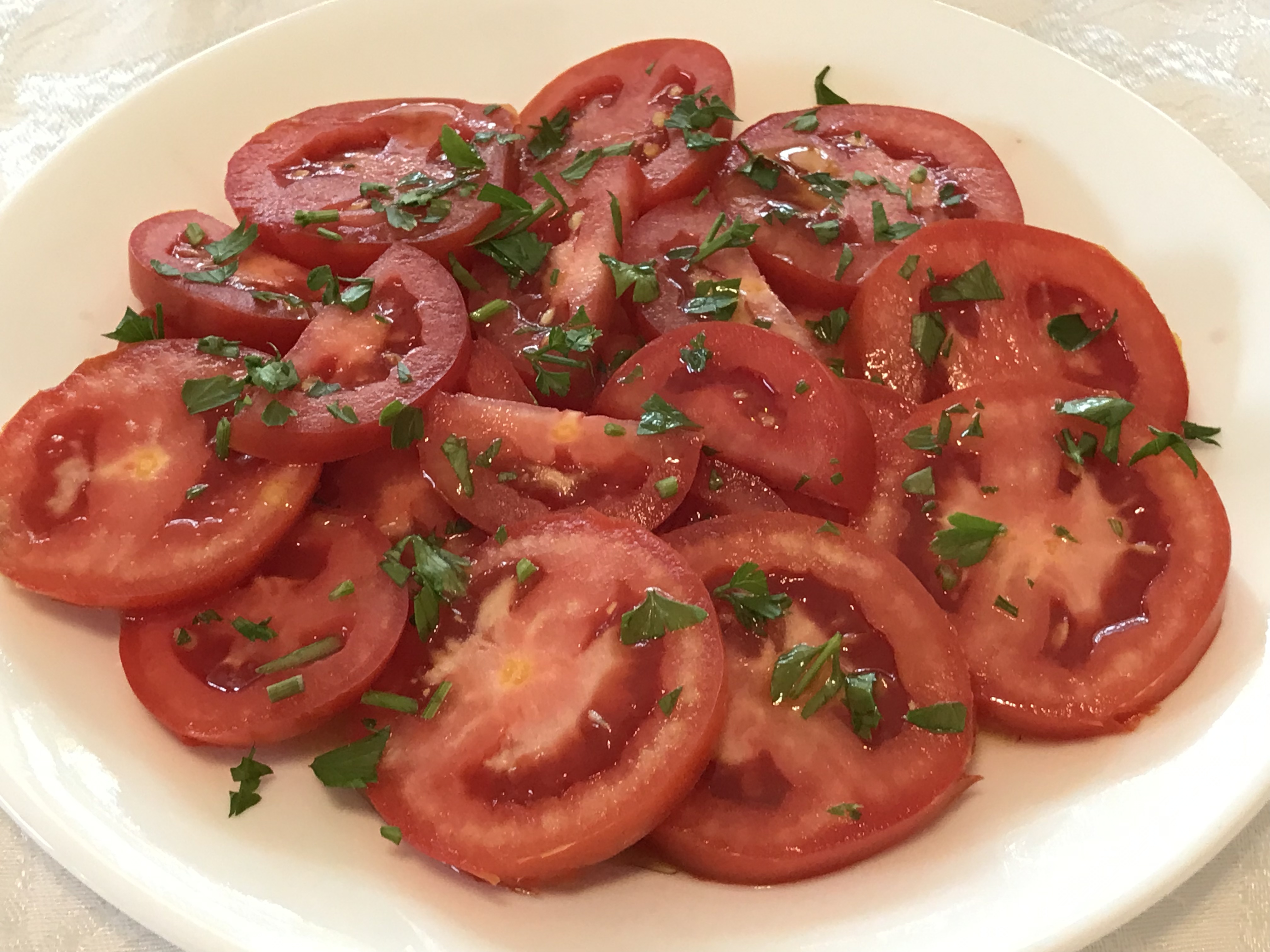 First, make sure you have fresh seasonal tomatoes. If so, cut them into chunks or thin slices, place on a plate, drizzle with olive oil, salt and pepper to taste, and garnish with chopped parsley for a beautiful red and green effect. (If tomatoes aren’t in season, choose a different meze dish for the best flavor.)
