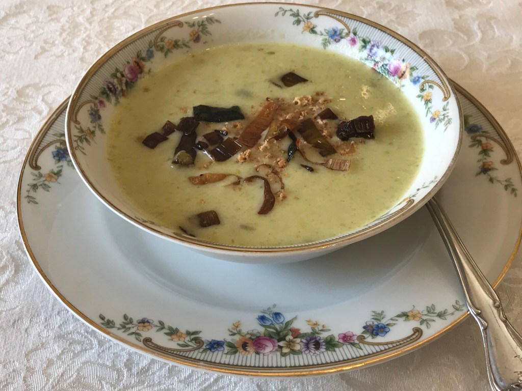 Menu: Asparagus Soup with Amaretti and Crisped Leeks, Lasagna Squares with Braised Broccoli Rabe, Butterflied Roasted Leg of Lamb, Slow-Cooked Plum Tomatoes, Spring Greens with Mint, Ricotta Cheesecake