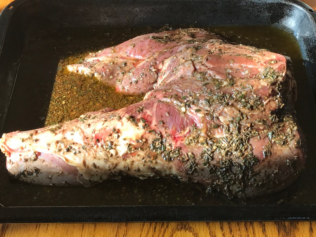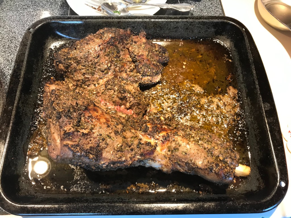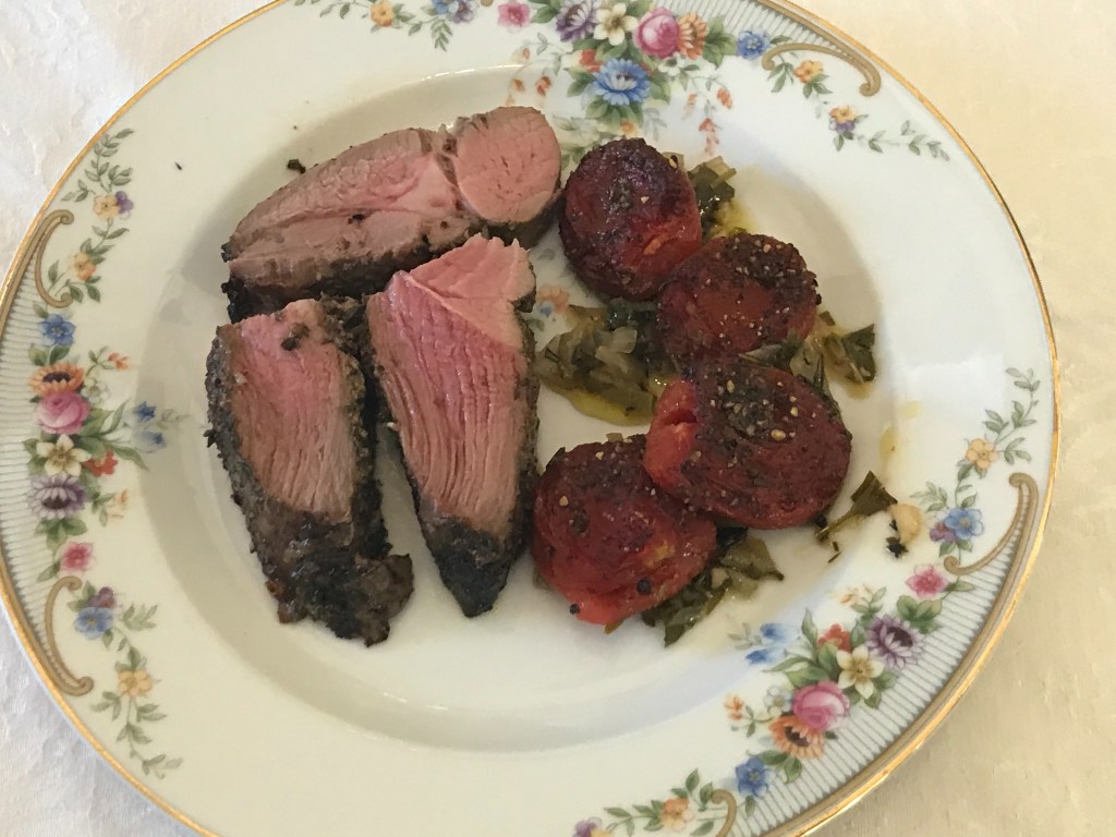 The lamb was the most technically challenging dish on the menu. Originally, I planned to get a few lamb chops and marinate them rather than use a leg of lamb, but since the latter was on sale for a really good price I decided to try it. (I’m a few months behind on posting, this was around Easter). The recipe says to ask the butcher to butterfly and trim it, but since I bought it frozen and shrink-wrapped that wasn’t an option. After letting it thaw for a few days, I would have to try and hope for the best. To be honest, I think I did a pretty good job, at least as far as getting it to lay flatter in the roasting pan, which was the point. After marinating overnight in a mix of vinegar, oil, garlic and herbs, it was broiled and occasionally basted with the marinade. The seasonings gave the meat a great flavor, and the sweet, acidic tomatoes worked really well alongside the rich, distinctive flavor of the lamb.