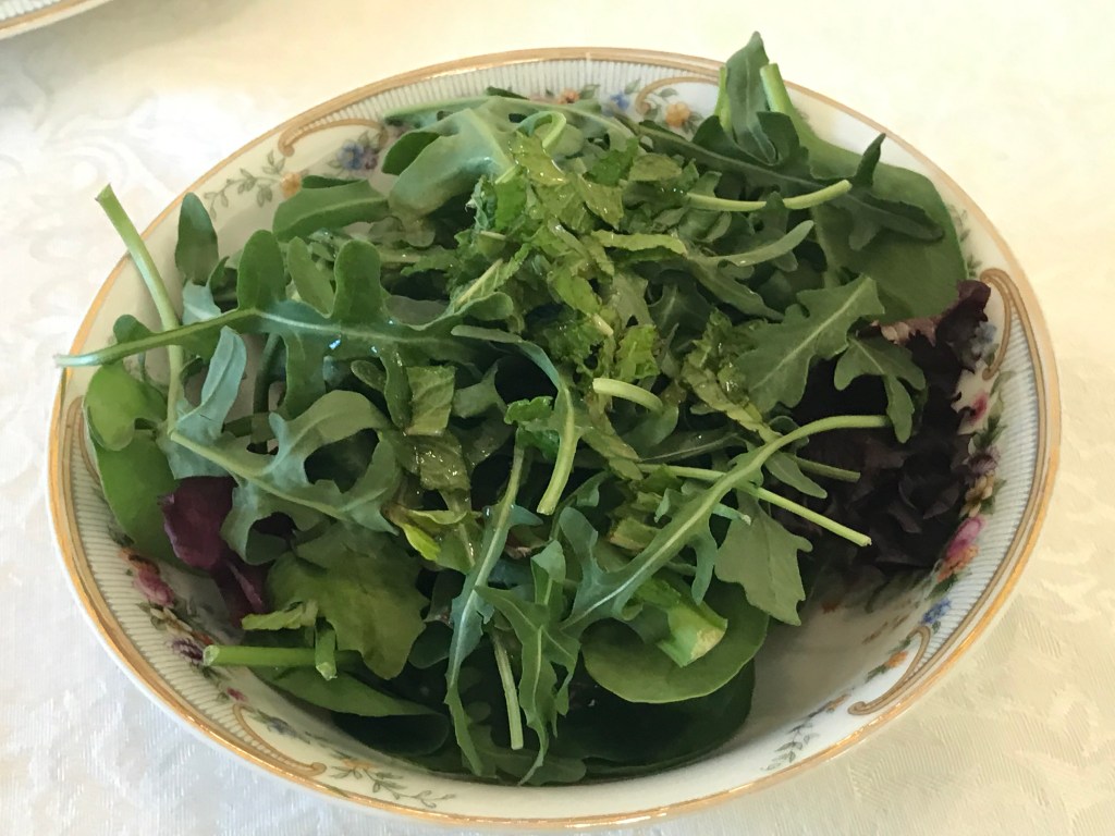 The salad, a mix of spring greens and arugula with a bit of mint, had a vinegar and oil dressing with a bit of garlic and anchovy. Since the amount of anchovy was small, it did not taste fishy, rather, it just added another layer of flavor. I wouldn’t have thought of putting mint in a salad, but it worked really well with the other flavors.