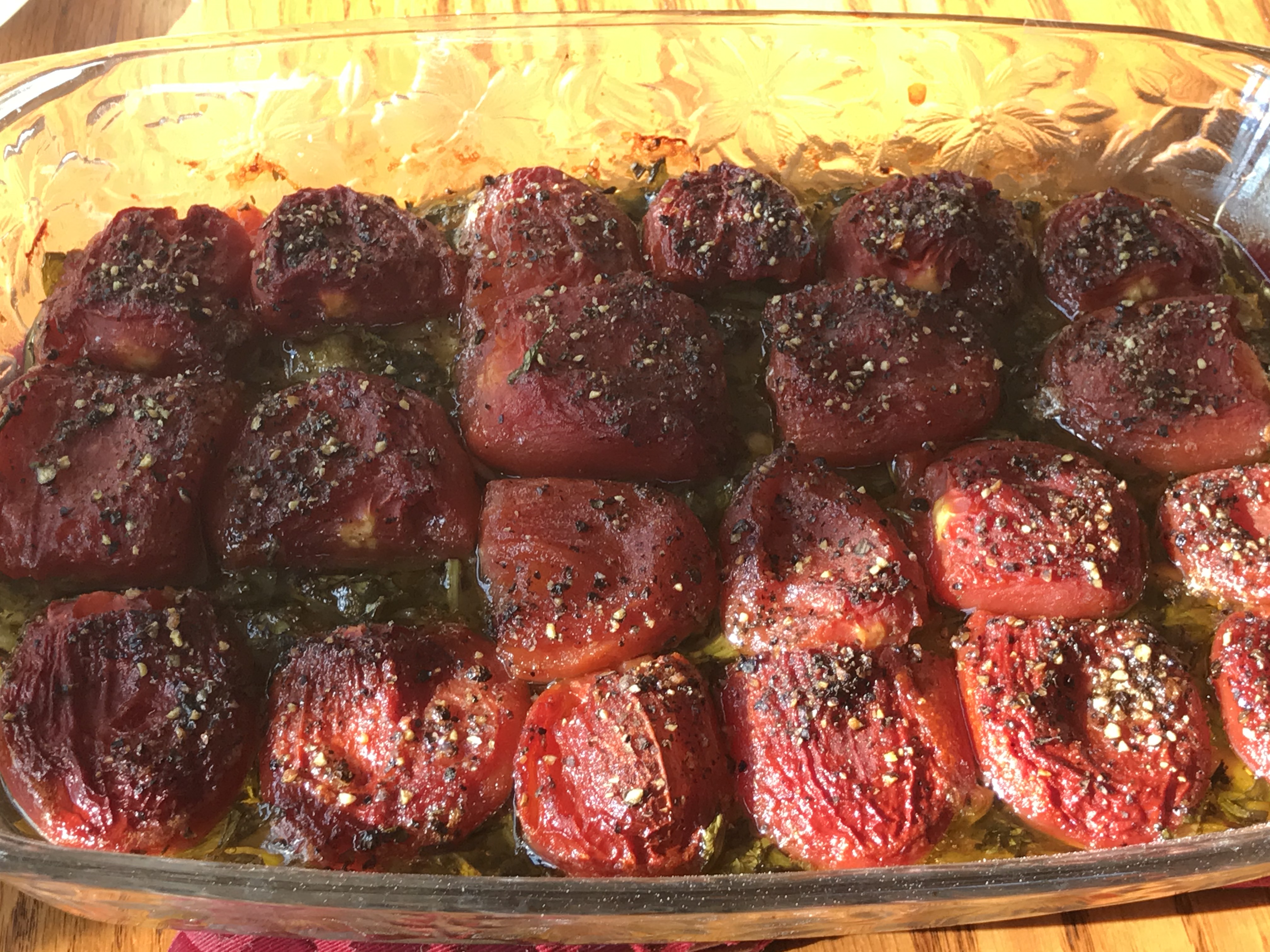 The lamb was the most technically challenging dish on the menu. Originally, I planned to get a few lamb chops and marinate them rather than use a leg of lamb, but since the latter was on sale for a really good price I decided to try it. (I’m a few months behind on posting, this was around Easter). The recipe says to ask the butcher to butterfly and trim it, but since I bought it frozen and shrink-wrapped that wasn’t an option. After letting it thaw for a few days, I would have to try and hope for the best. To be honest, I think I did a pretty good job, at least as far as getting it to lay flatter in the roasting pan, which was the point. After marinating overnight in a mix of vinegar, oil, garlic and herbs, it was broiled and occasionally basted with the marinade. The seasonings gave the meat a great flavor, and the sweet, acidic tomatoes worked really well alongside the rich, distinctive flavor of the lamb.