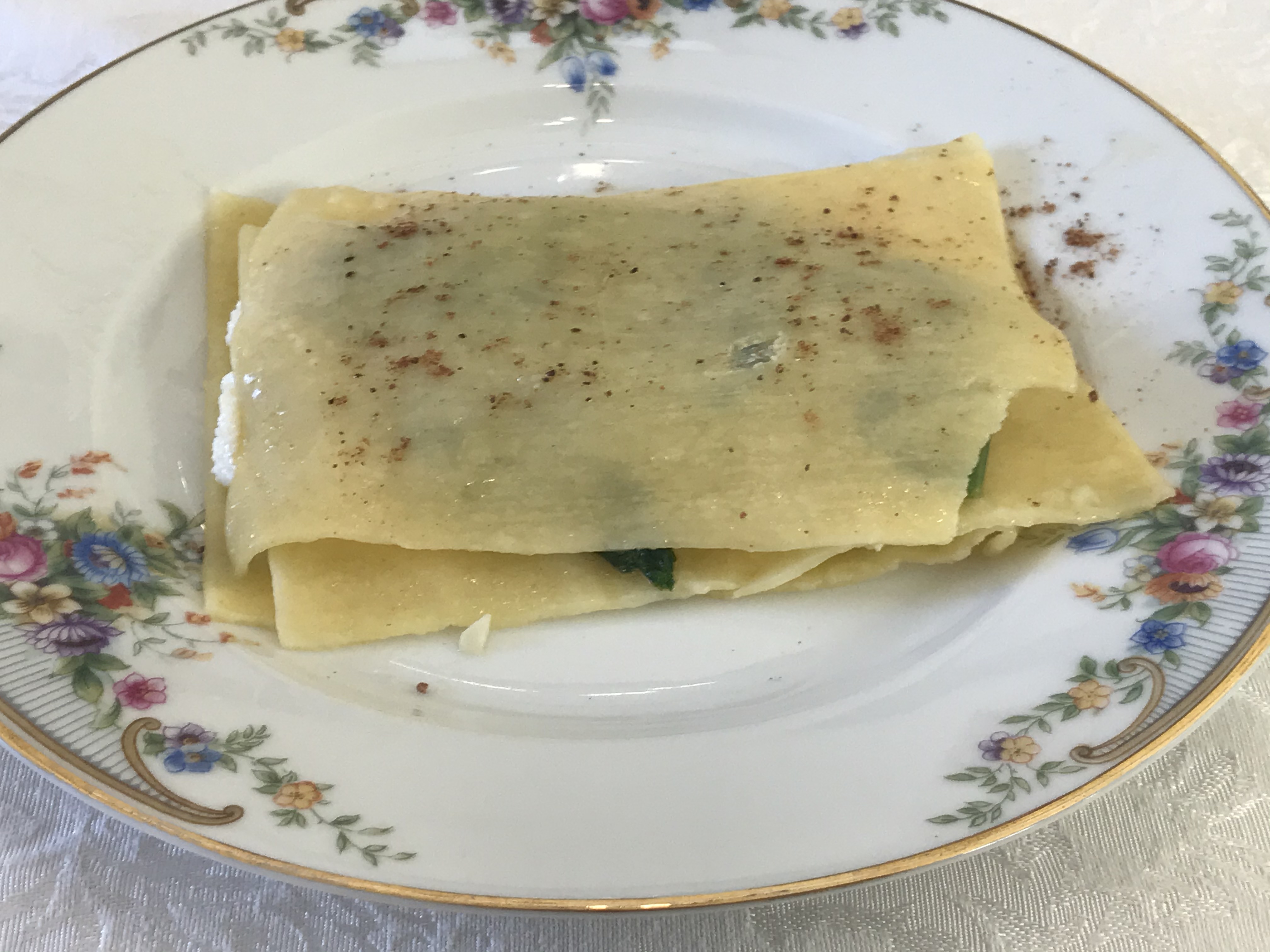For the pasta course, we have an interesting spin on lasagna. Rather than layered and baked in a single pan, fresh pasta squares and broccoli rabe (here replaced with mustard greens) are cooked separately, then layered with ricotta on each individual plate. While this method did free up oven space for the other dishes, it involved more work at mealtime. Only a few of the pasta squares can cook at a time, and they cook in about a minute. Once finished, each batch is placed in a bowl with a bit of butter to stay hot and hopefully avoid sticking. This was still a bit of an issue, and the ricotta, which was not heated, cooled down the finished dish. It was still pretty good, but more warm/lukewarm than hot.